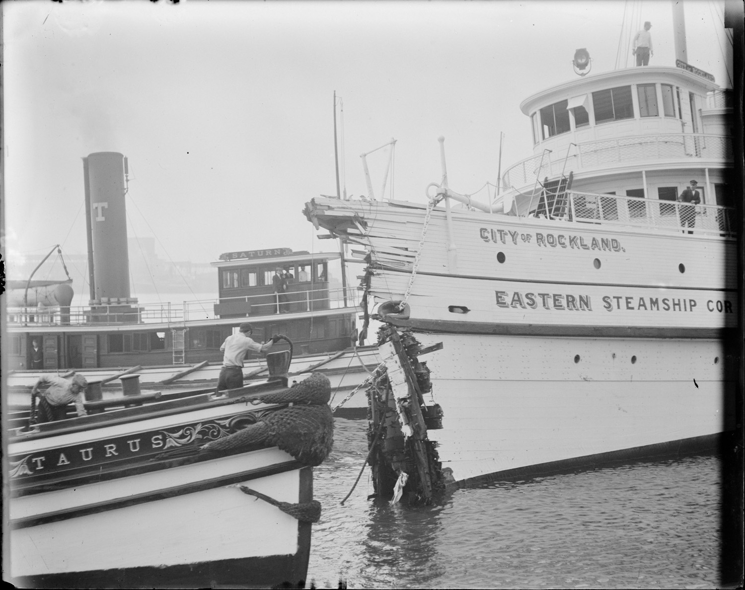 Bow of 'Nantasket' after ramming schooner 'Isabelle Parker' off Gallops Island in Boston Harbor. |