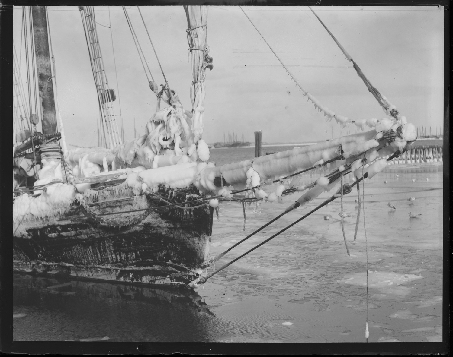 Fishing schooner 'Eleanoria Nickerson' arriving at fish pier - clad in ice
