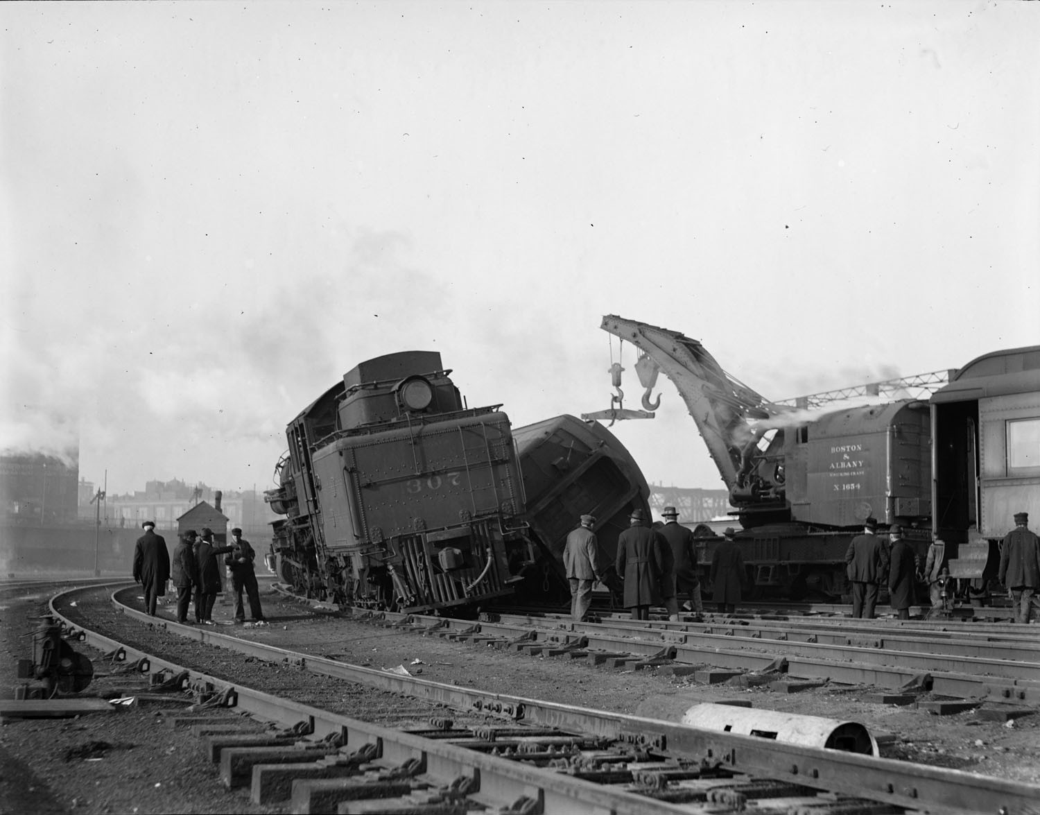 Train wreck. Boston & Albany RR tank locomotive No. 307. B&A RR wrecking crane No. X1654 assisting.