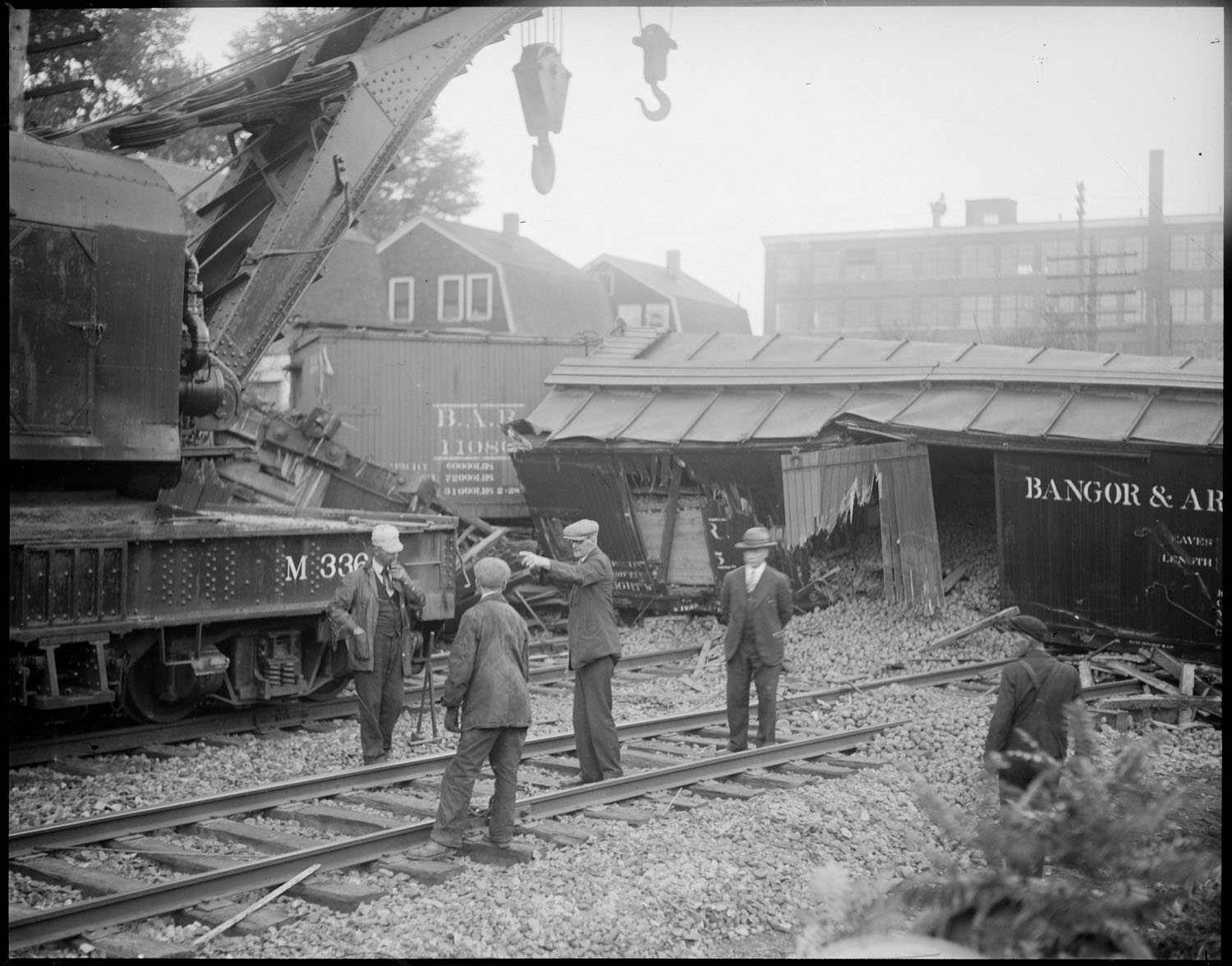 Crane on tracks clearing Bangor & Aroostook freight cars