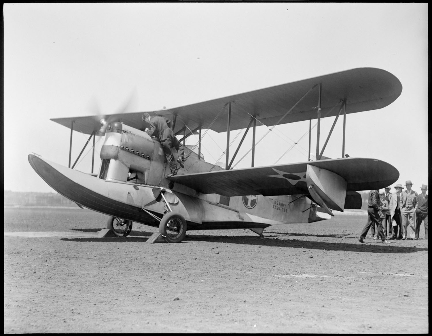 The amphibian plane that Lt. Richard Coff used in rushing a pilot to Greenly Island to relieve one stricken. U.S. Army plane AC27-323