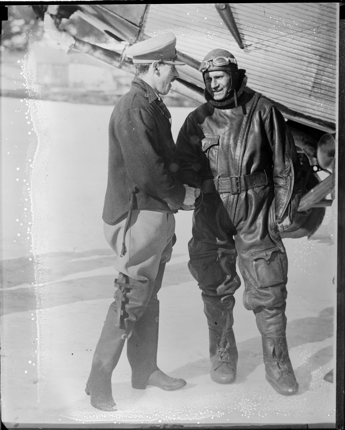 Lt. Ellwood R. Quesada, relief pilot from Bolling Field to go to Greenly Island, Labrador, to take over for Lt. Fairchild who was stricken with appendicitus, and Lt. Richard Cobb who took him