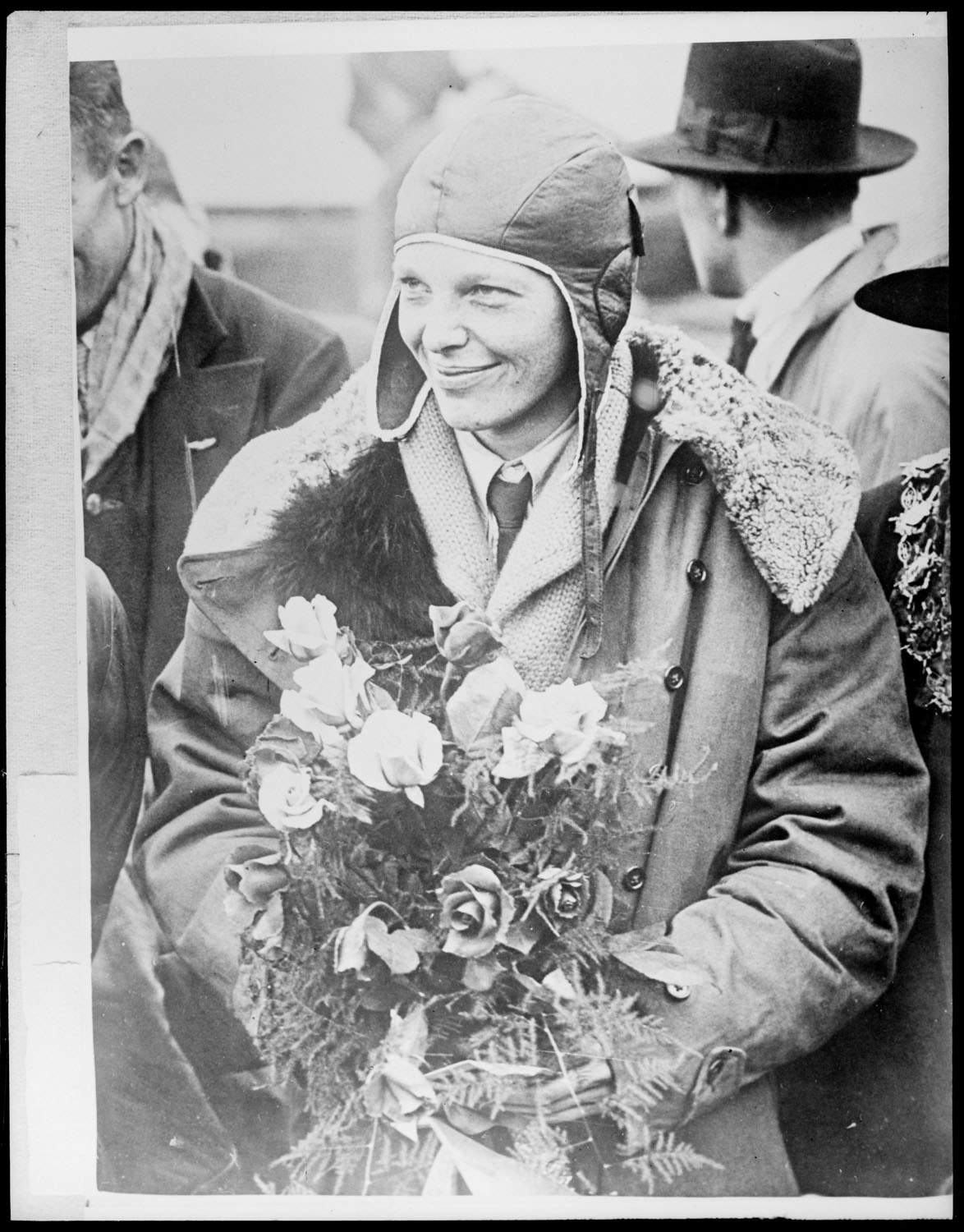 Miss Amelia Earhart's guests greet her when she arrives at East Boston Airport.