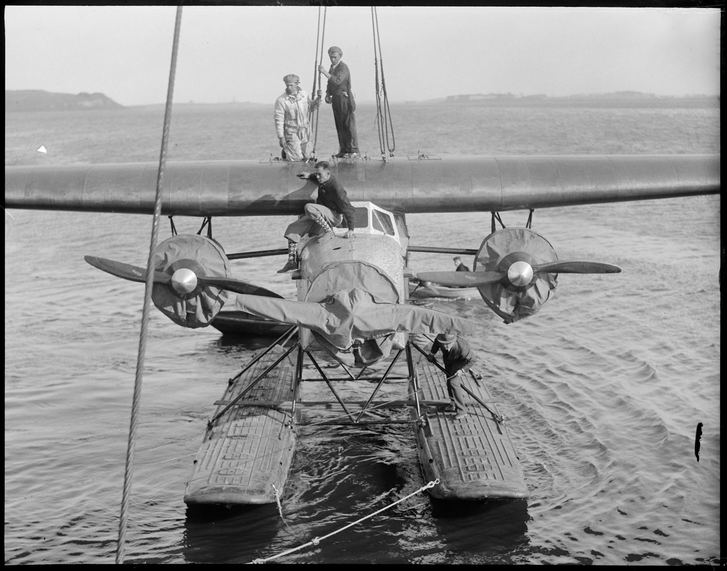 Byrd's South Pole plane in water off East Boston after being fitted with pontoons.