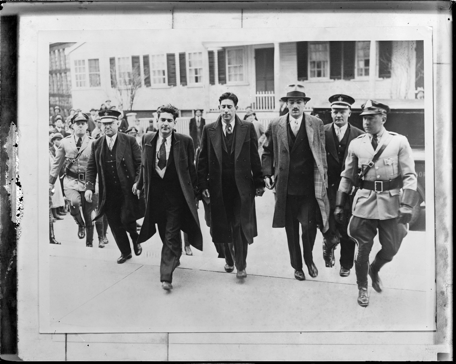 Three men brought in by deputy sheriffs. Winton Millen, Irving Millen and Abraham Faber - on trial for murder of 2 policeman during a Needham bank robbery. (JPJ)