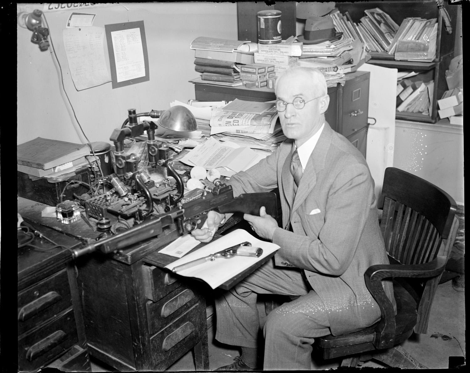 Capt. Charles J. Van Amburgh, state police ballistics expert with gun that shot Needham policemen