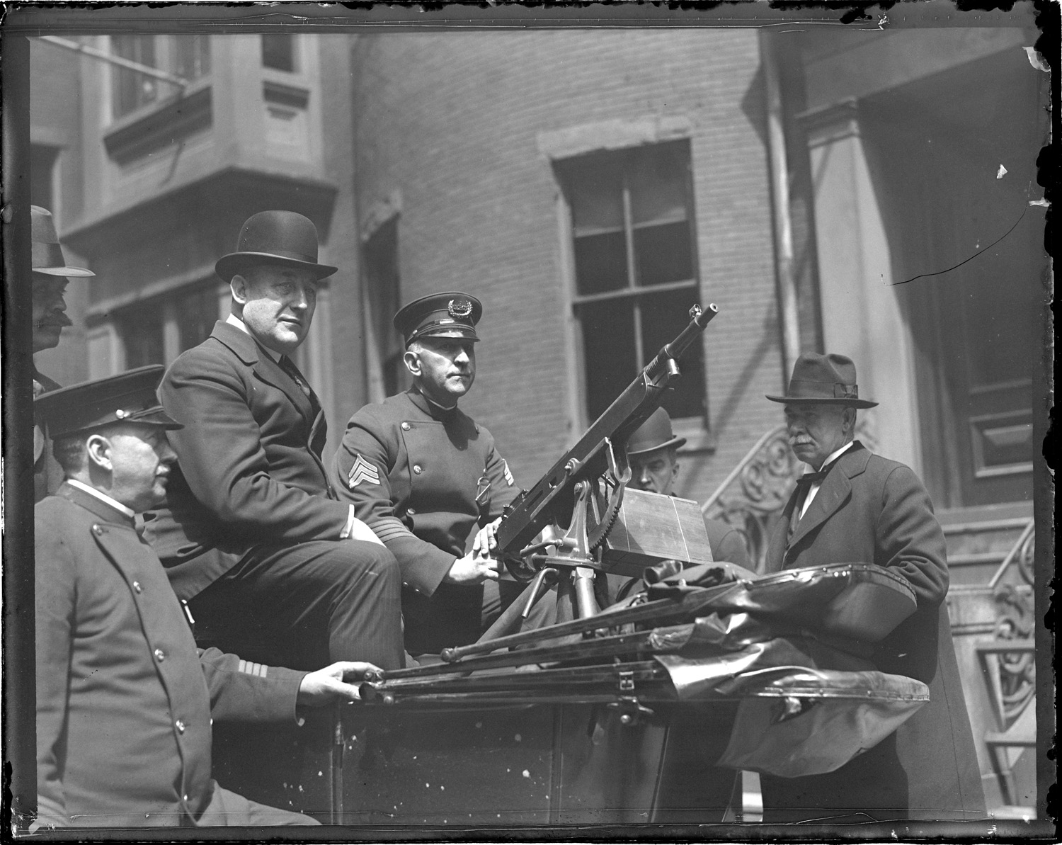 Superintendent Mitchell Crowley with machine gunners at headquarters. They are ready for big May Day riots