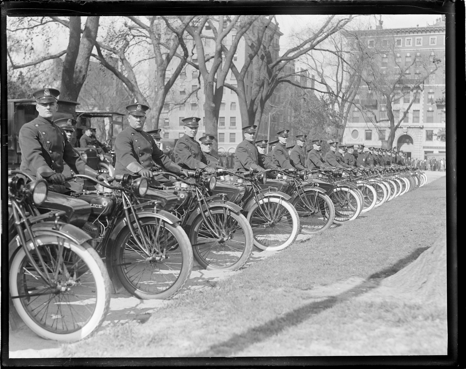 Motorcycles and sidecars on Beacon Street, Boston Police Parade |