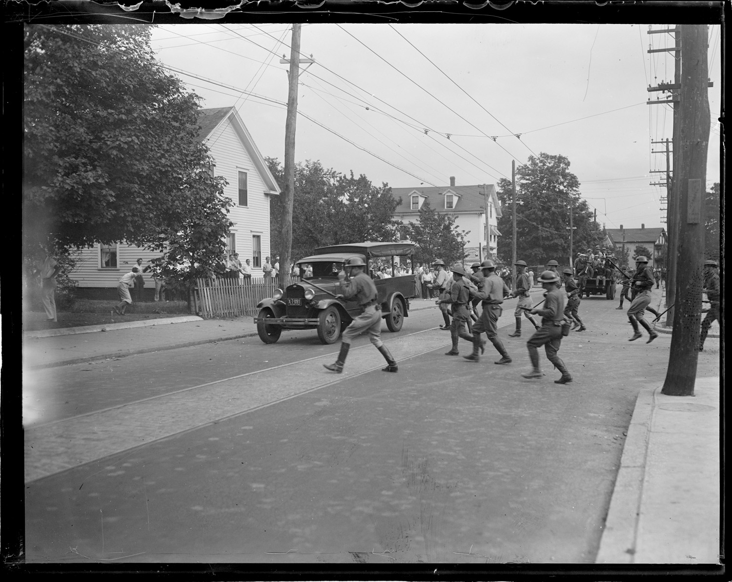 Soldiers set up barbed wire at strike scene in Rhode Island.