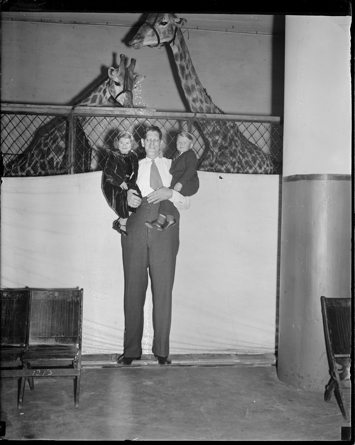 Circus days: Tall man holding two girls in front of giraffes