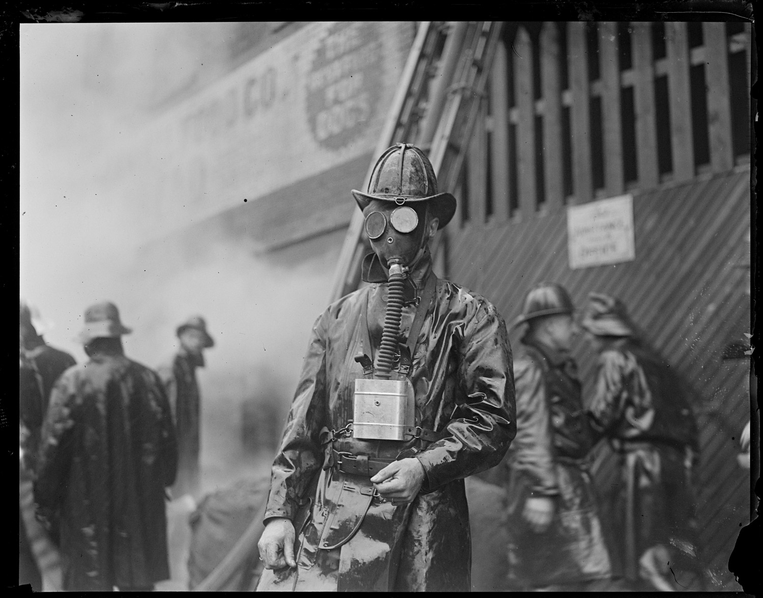 Fireman Arthur Thompkinson of Ladder 1, Chelsea, working in gas mask during two alarm rag shop fire