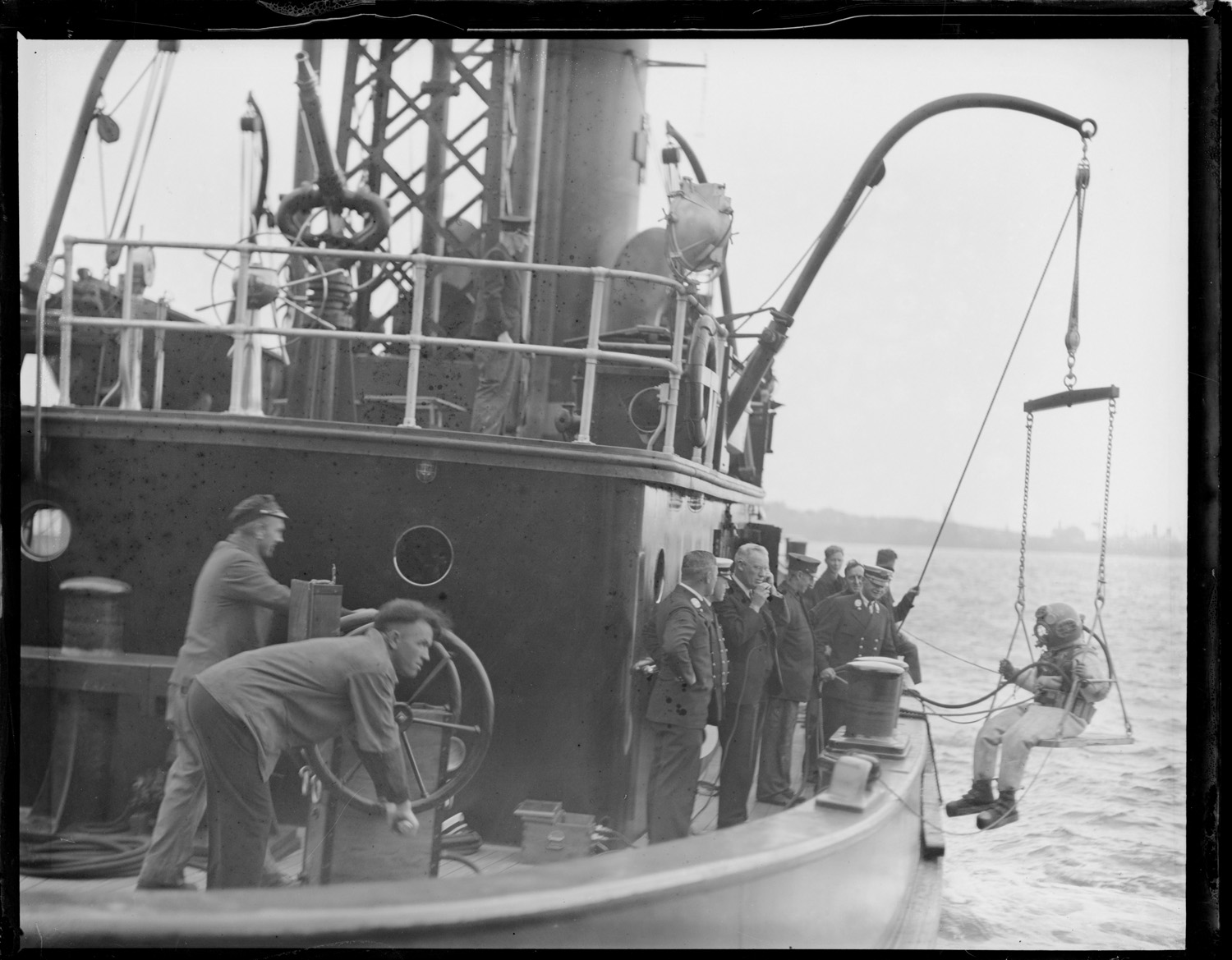 Navy Yard diver going down to repair collar on USS Milwaukee by using torch