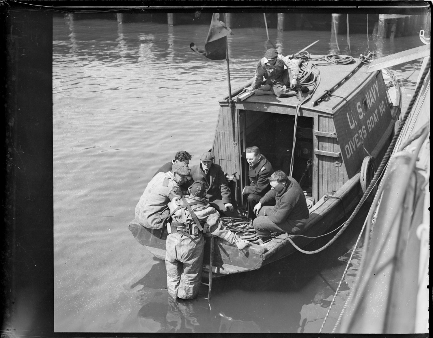 Navy Yard diver John Evans ready to go down with oxy-hydrogen torch to repair collar on propeller shaft of the USS Milwaukee |