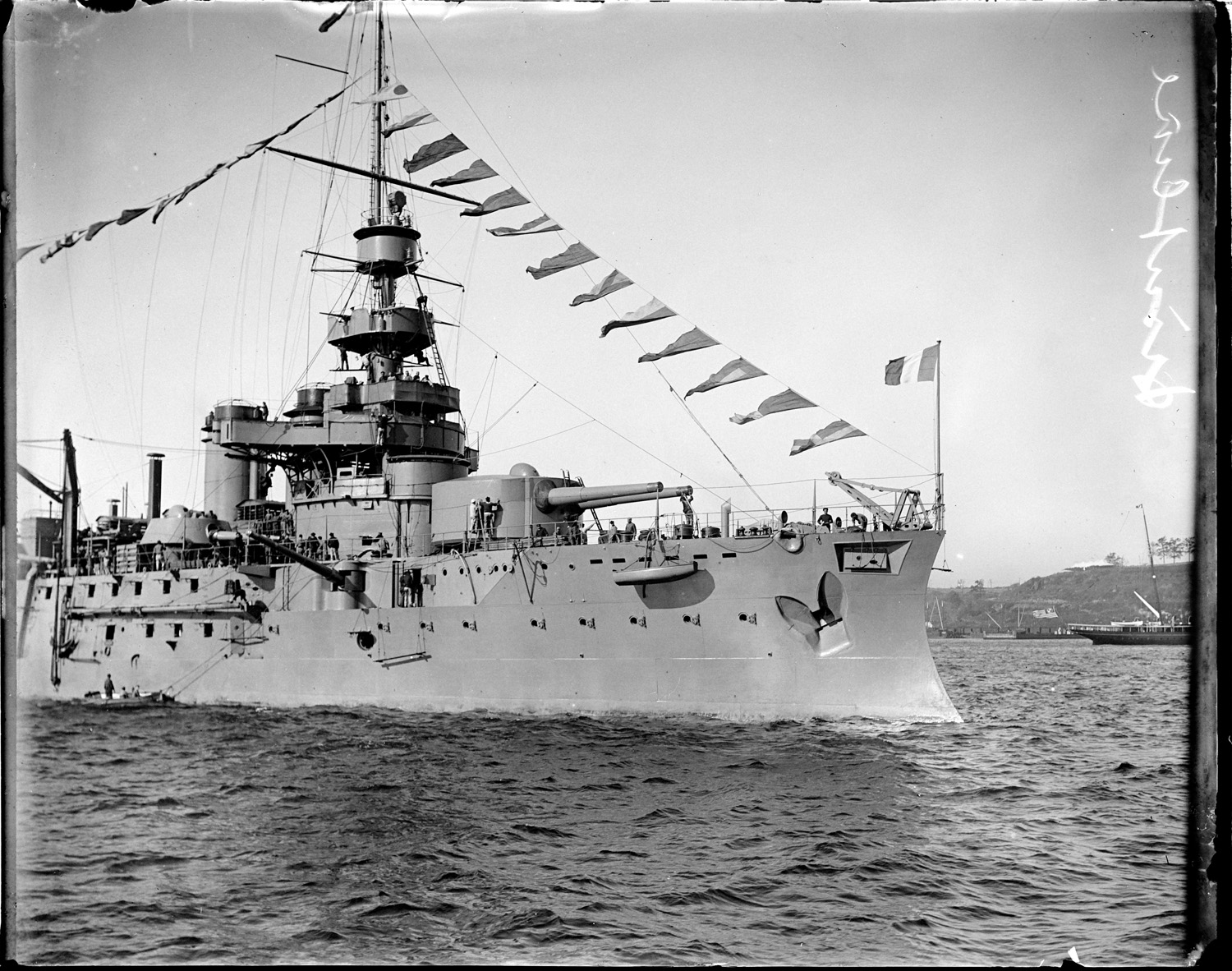 Santa Claus and Christmas tree aloft on mast of the USS Raleigh, at Navy Yard