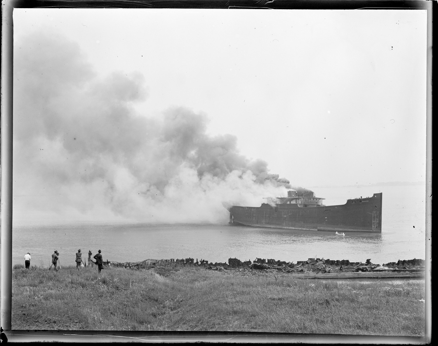 Ship burning in Boston Harbor. 'Wakanna' wooden ship off Apple Island. 'Scrapped'. Photographers on left.
