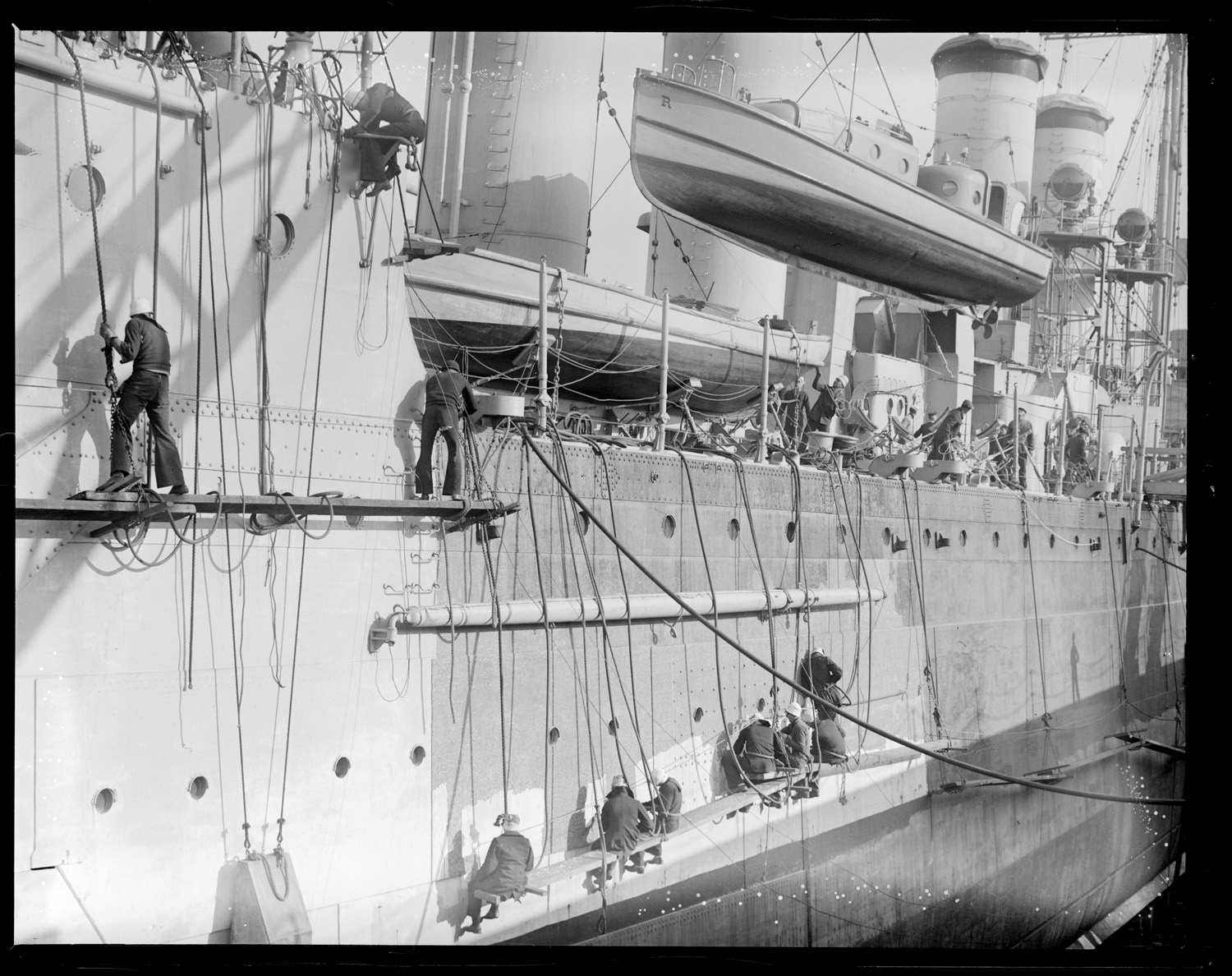 Crew painting hull of the USS Portland, Navy Yard drydock