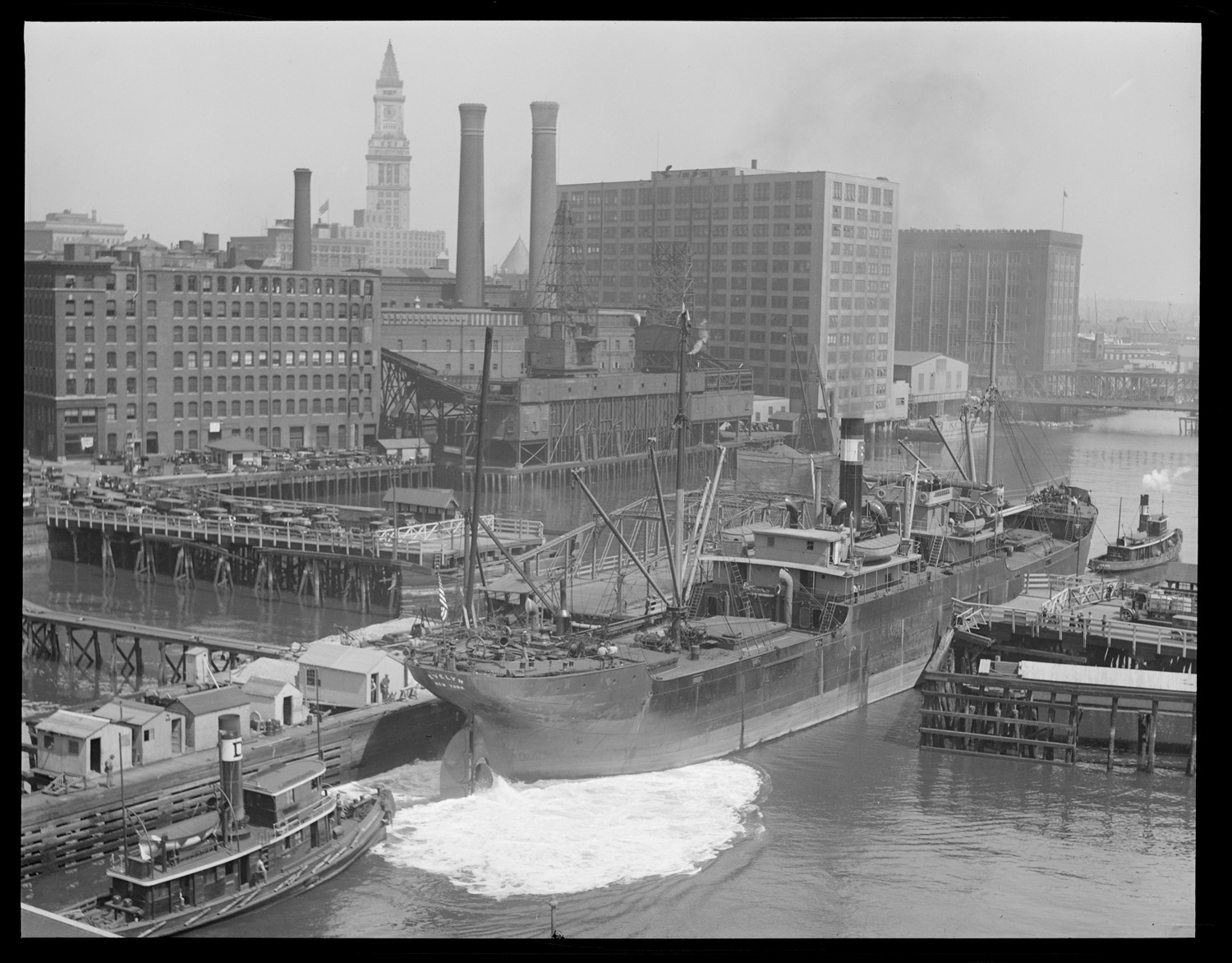 Bull line sugar boat SS Evelyn making its way through the Fort Point Channel