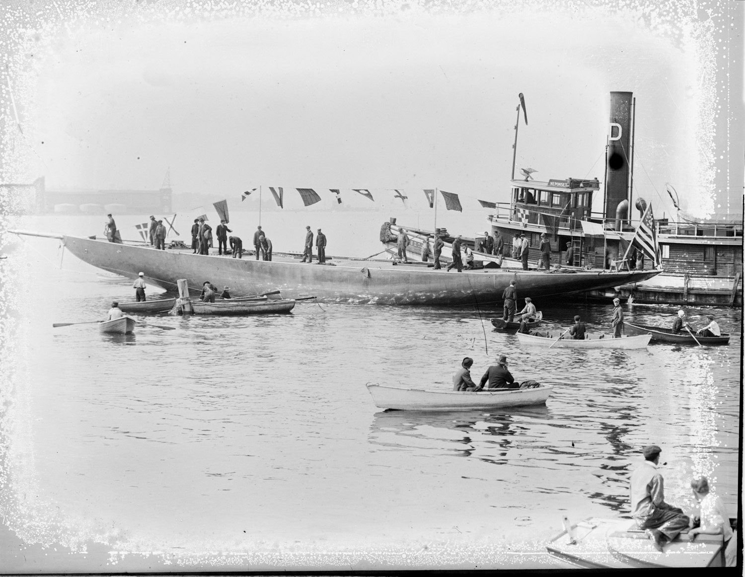 Flat boat (Launching Yacht - Lawleys? Tug boat Neponset)