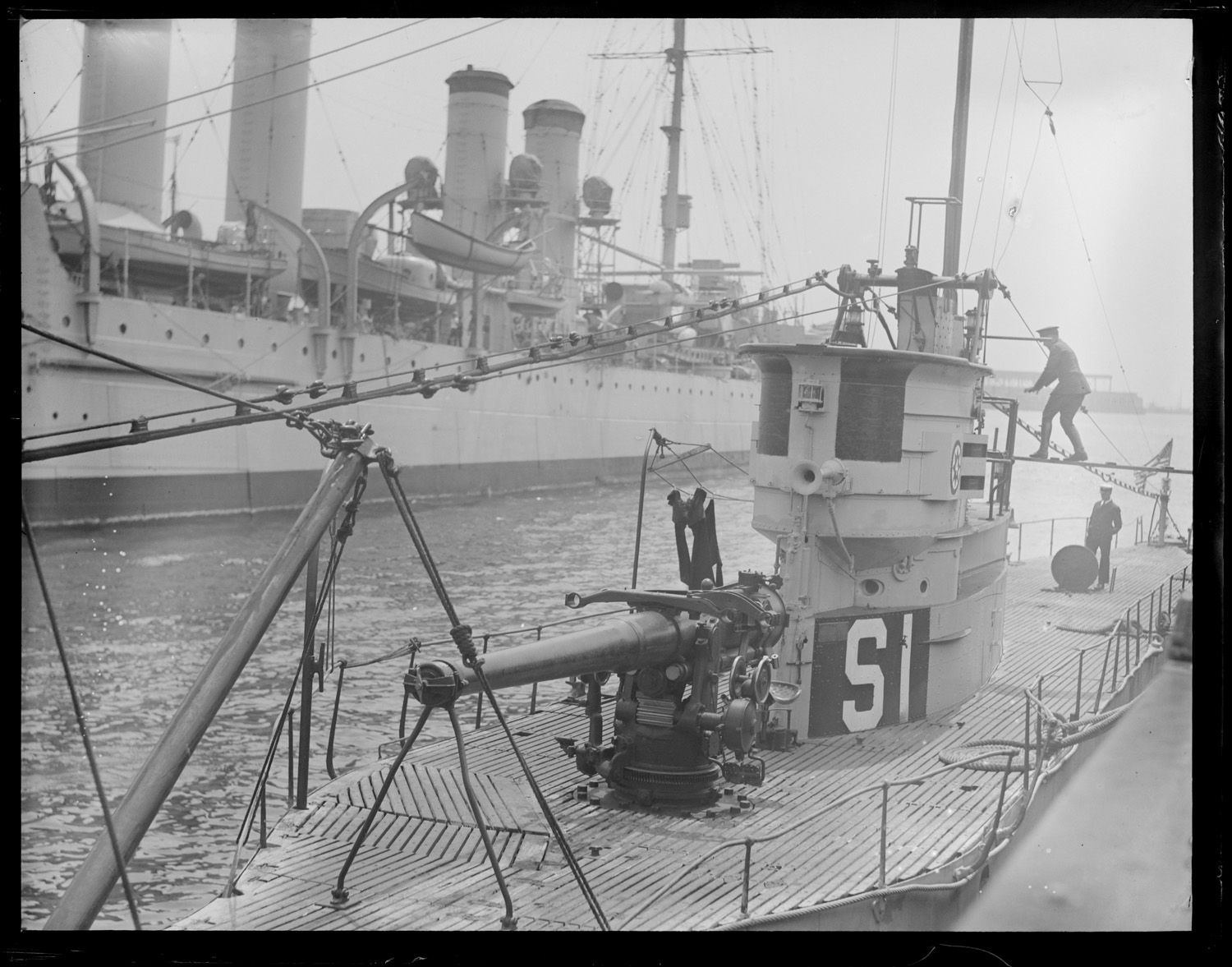 Officer and crewman on deck of sub S-1 converse over gun, at Navy Yard
