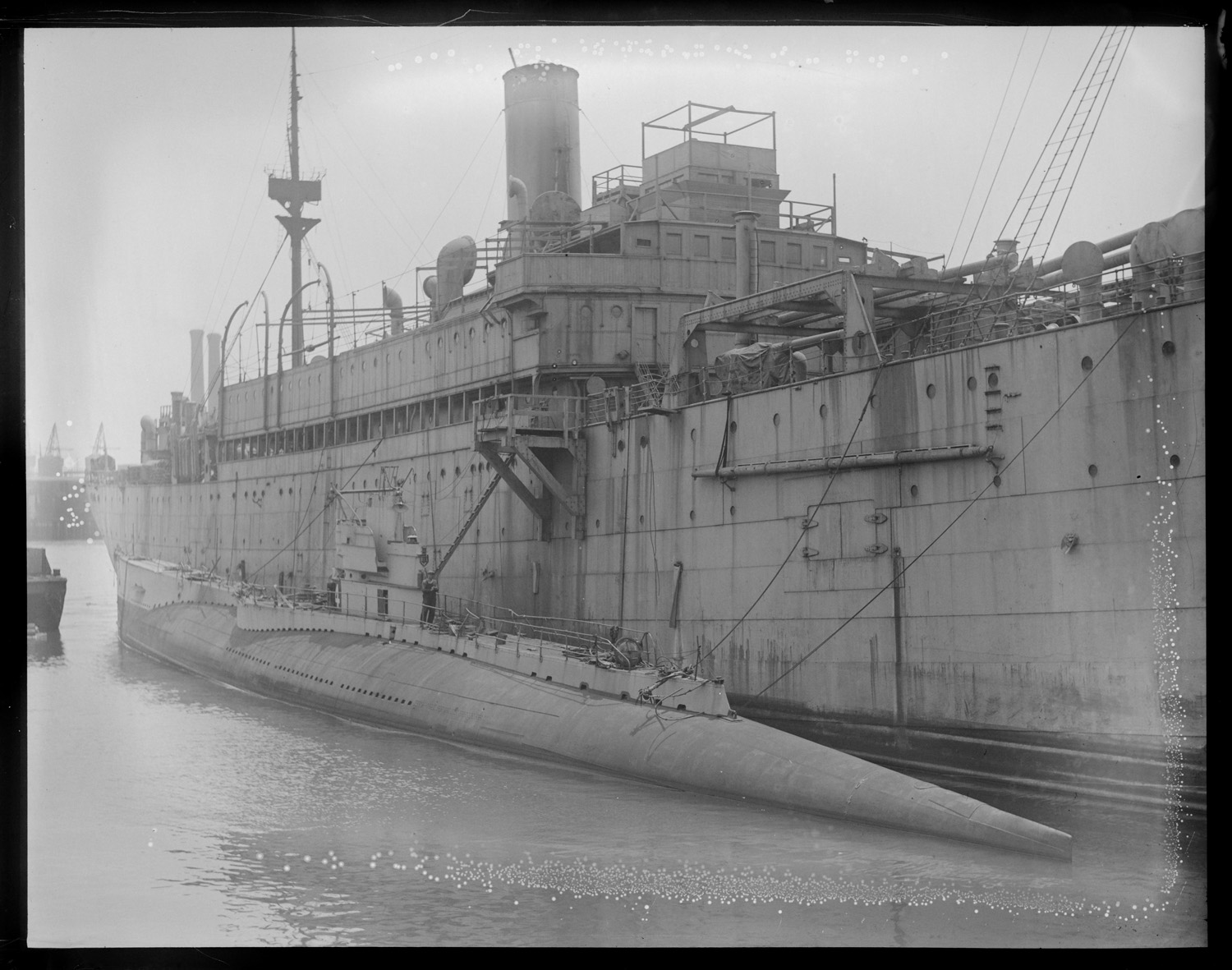 Preparing sub S-4 for refloating after she was temporarily repaired. |