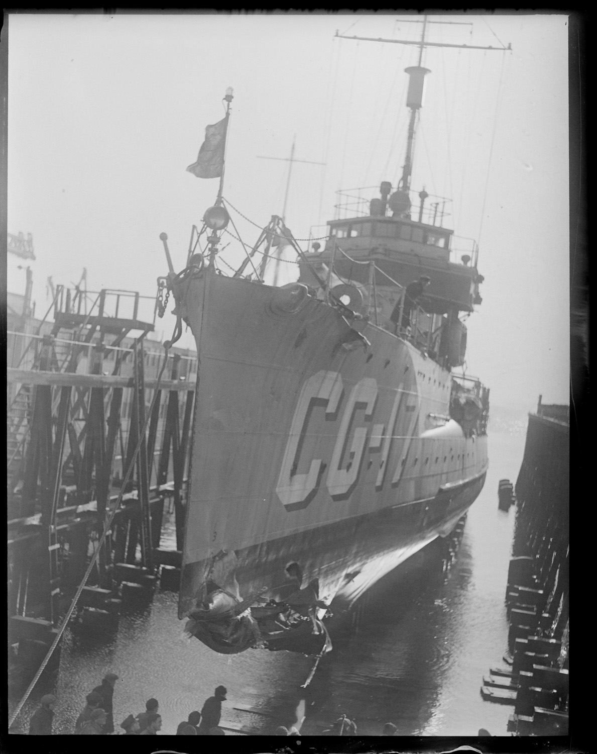 USS Paulding on Marine Railway after bow was damaged ramming the S-4 off Provincetown.