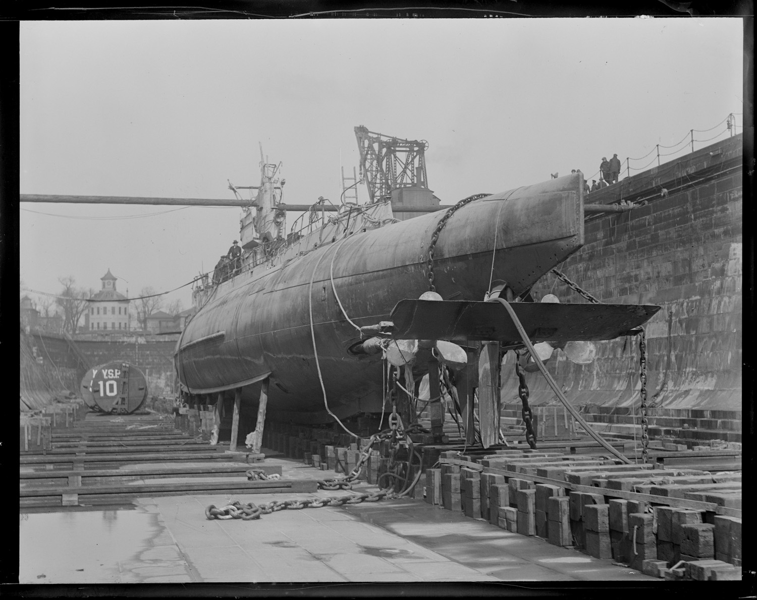 Ill-fated sub S-4 in drydock after sinking off Provincetown. |