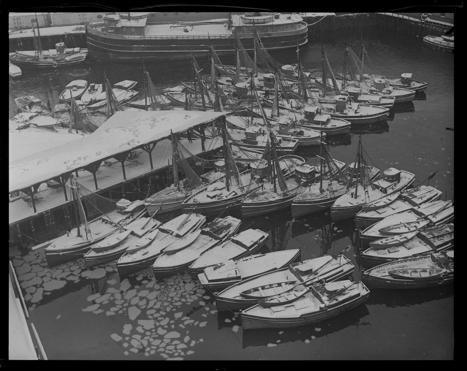 Italian fishing fleet tied up at T-wharf on account of storm.
