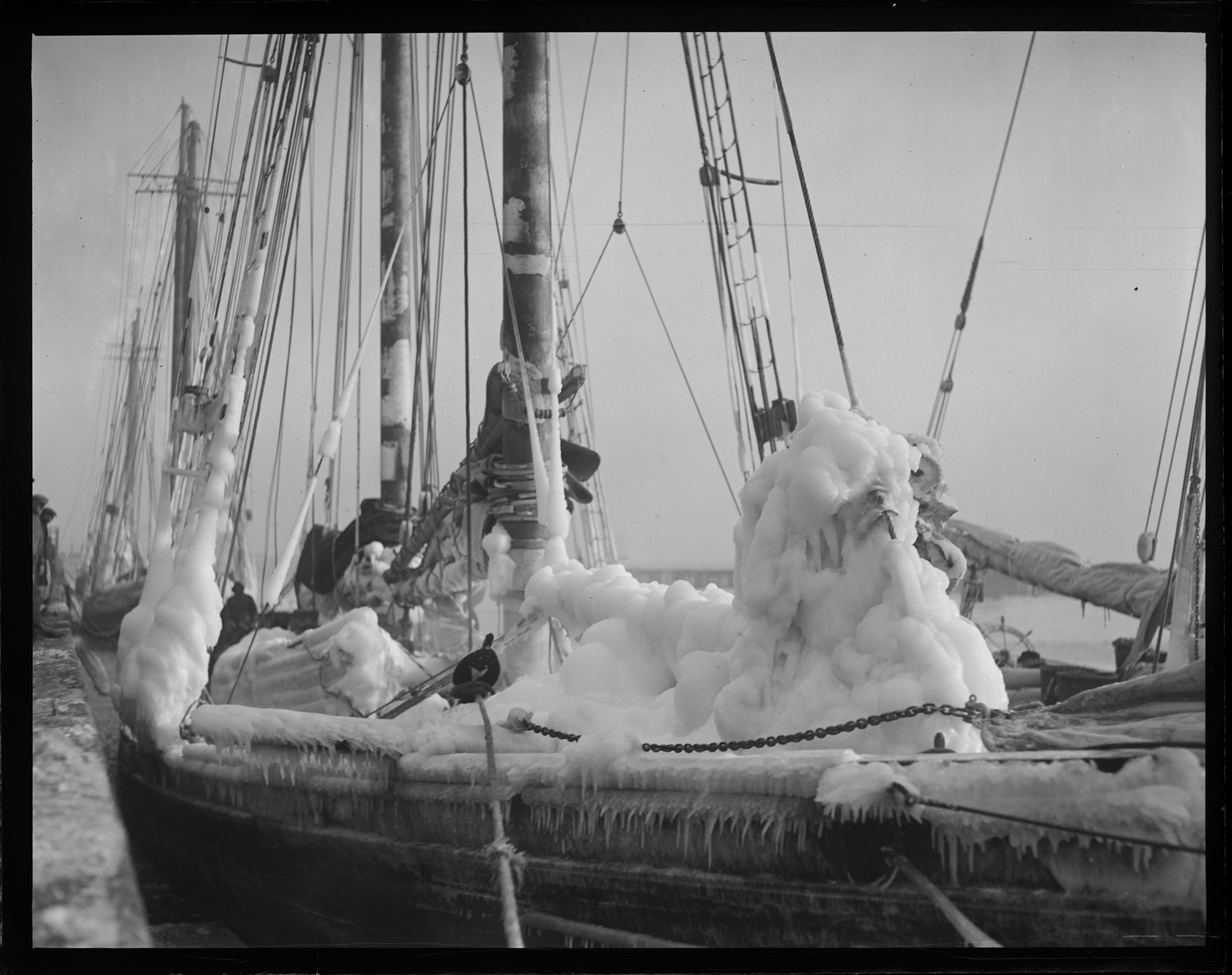 Fishing schooner 'Eleanoria Nickerson' arriving at fish pier - clad in ice