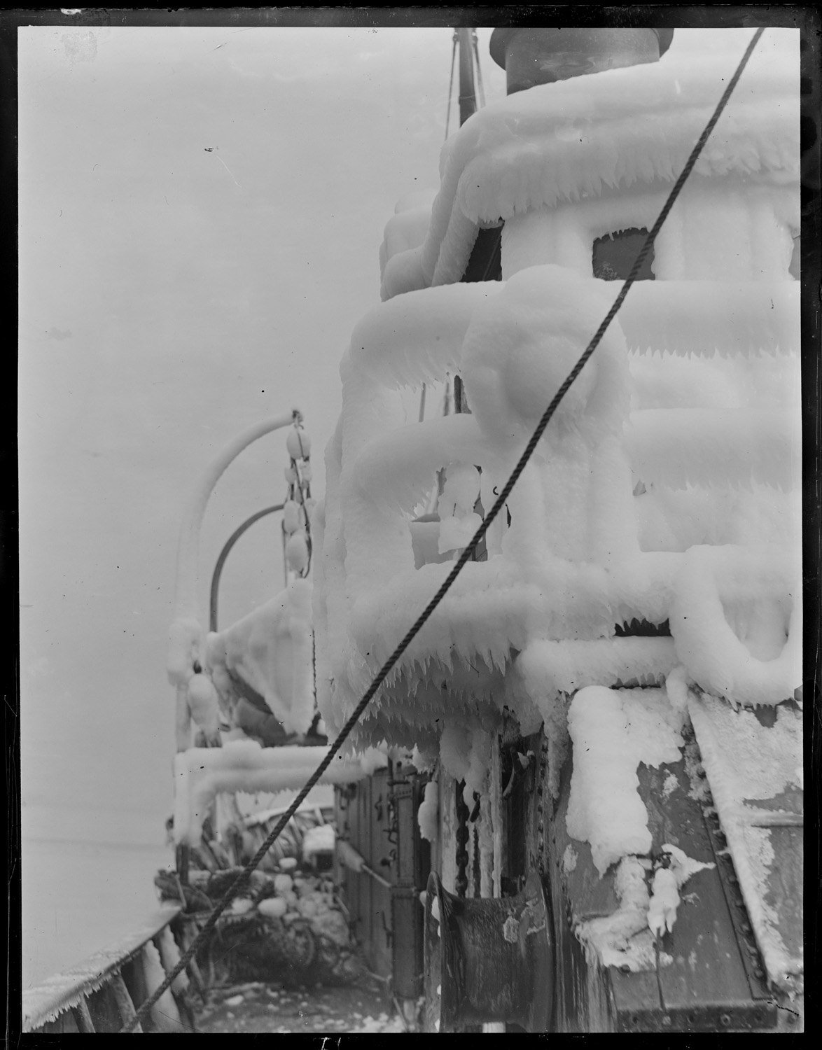 Bow of steam trawler covered with ice at T-wharf.