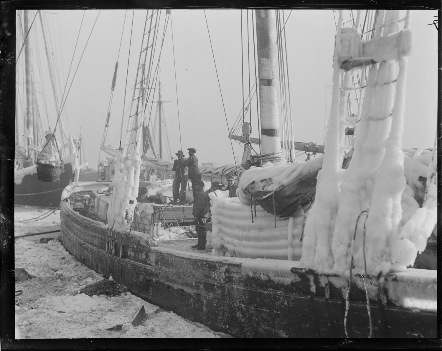 Fishing schooner 'Eleanoria Nickerson' arriving at fish pier - clad in ice