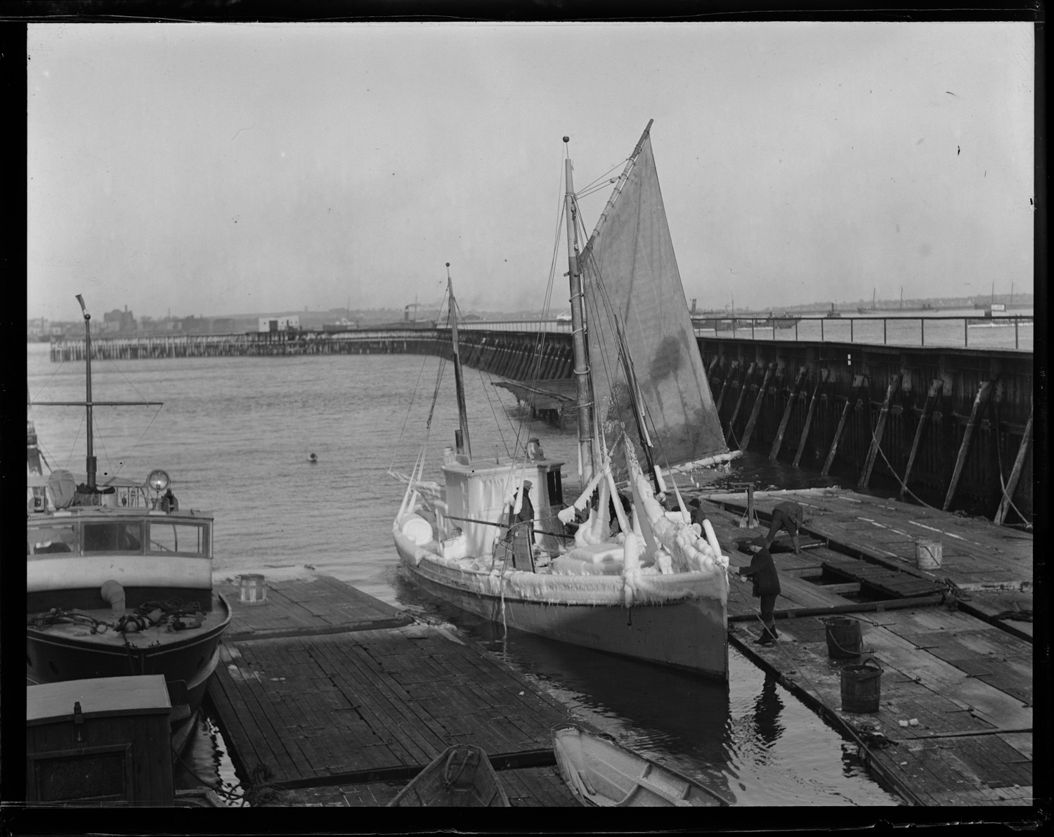 Fishing schooner 'Gov. Fuller' ice clad at fish pier