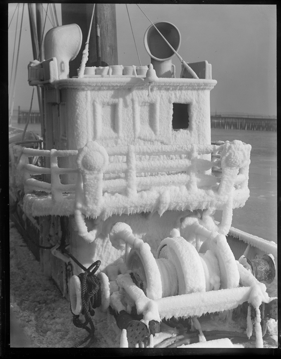 Fishing schooner 'Eleanoria Nickerson' arriving at fish pier - clad in ice