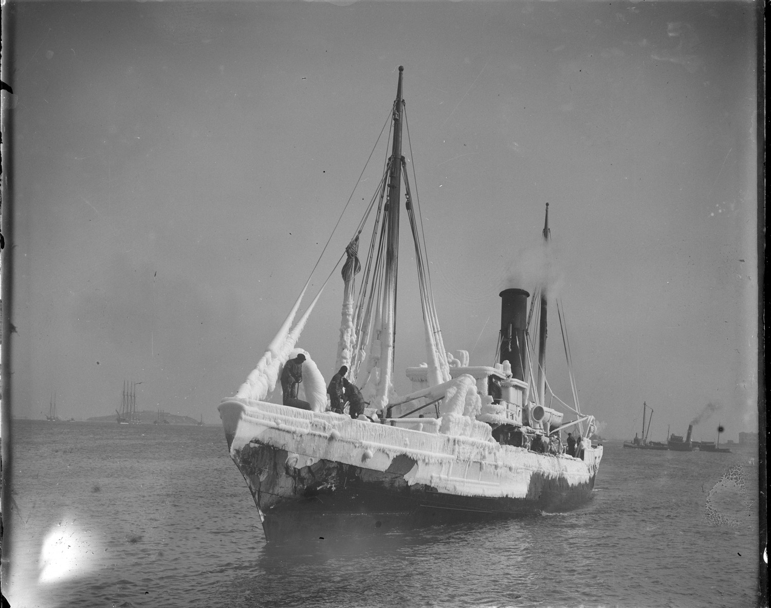 Fishing schooner 'Eleanoria Nickerson' arriving at fish pier - clad in ice