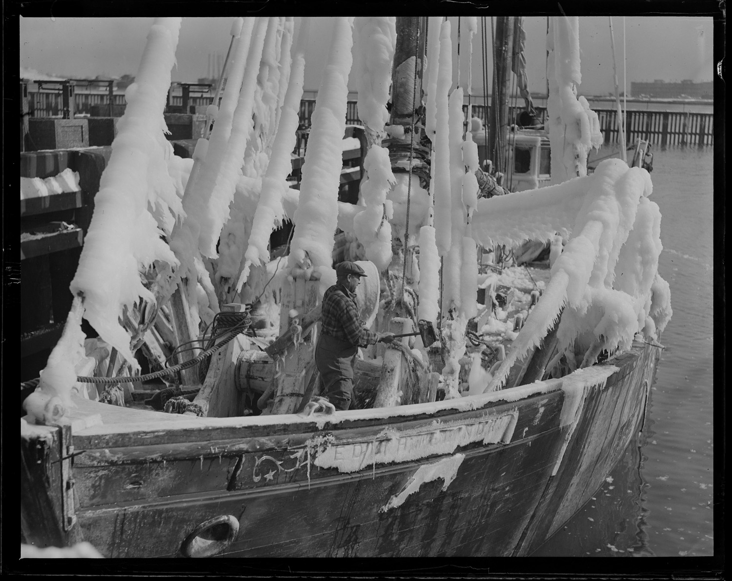 Fishing schooner 'Edith and Elinor' clad in ice.