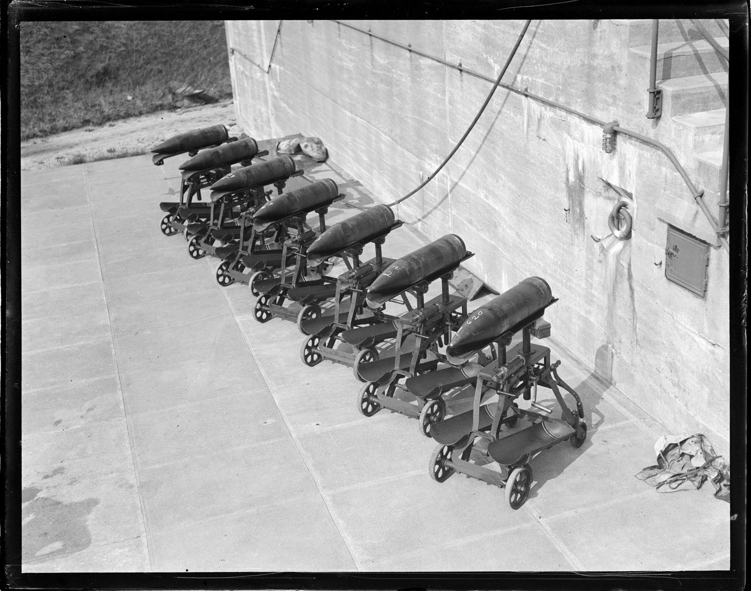 Big gun shells Boston Harbor. 10' projectiles on shotcarts, Fort Standish, HD Boston.