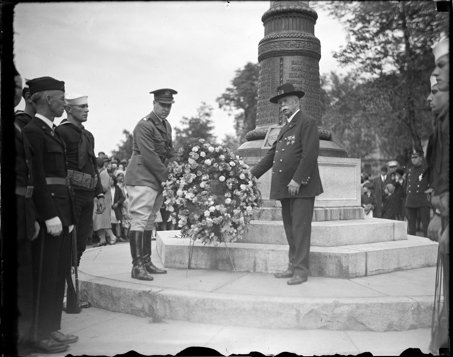 G.A.R. men decorate the soldiers and sailors monument on Boston Common