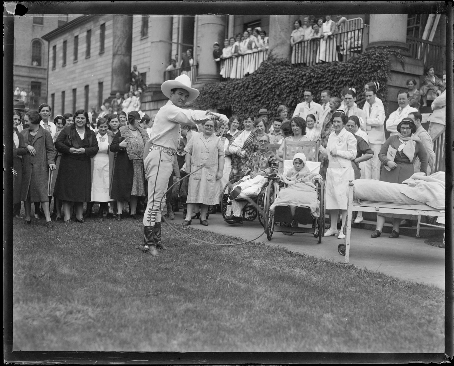 Tom Mix performs rope tricks for invalids at Mass. General
