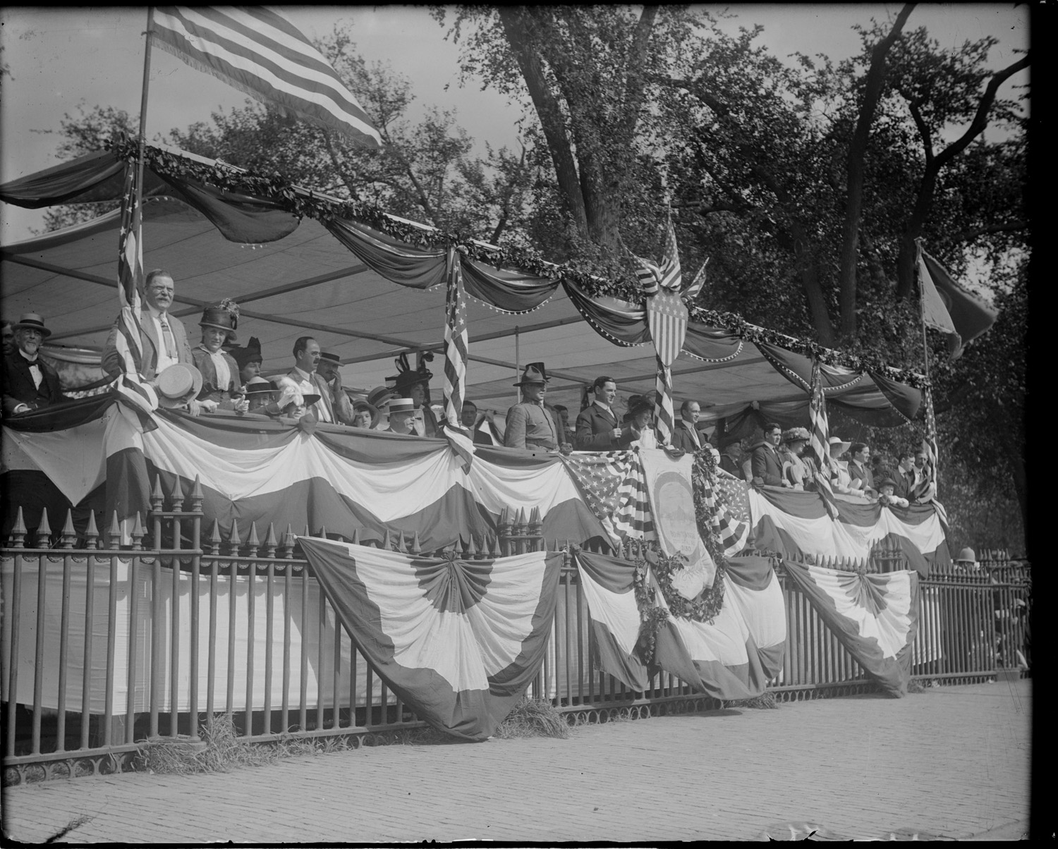 Mayor Curley looks on as daughter Mary presents big sum of money to Gen. Joffre for French orphans, on Boston Common (Gen. Edwards to left)
