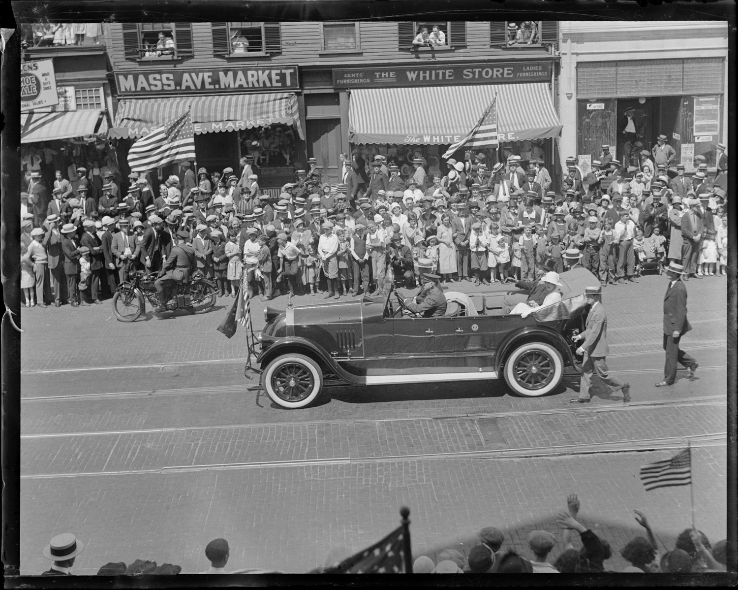Pres. and Mrs. Coolidge rushing through Plymouth, MA. Cheering crowds bring rare smile to President. |