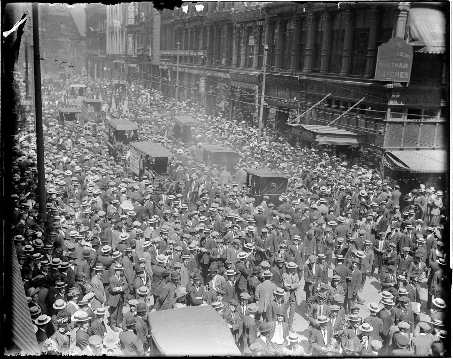 Crowd in front of the Boston Globe building on Washington Street, following the World Series