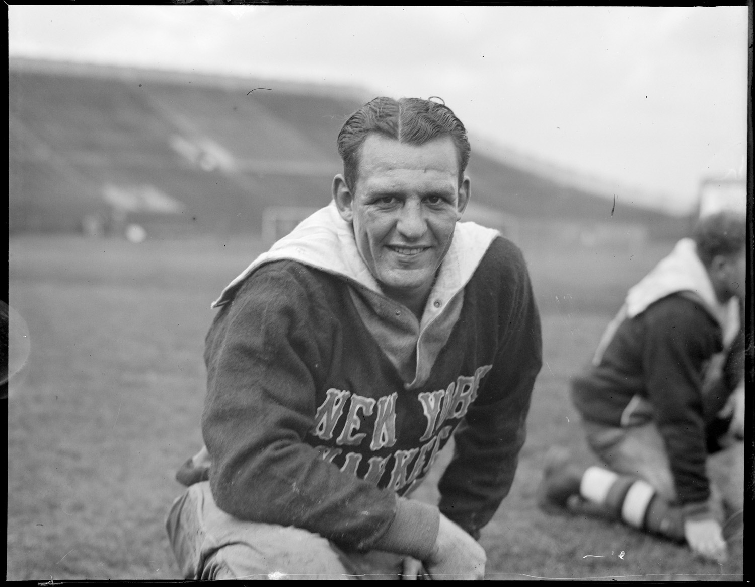 Red' Grange kicking as Carl Brumbaugh holds - quarterback for Chicago Bears. Braves field, Boston.