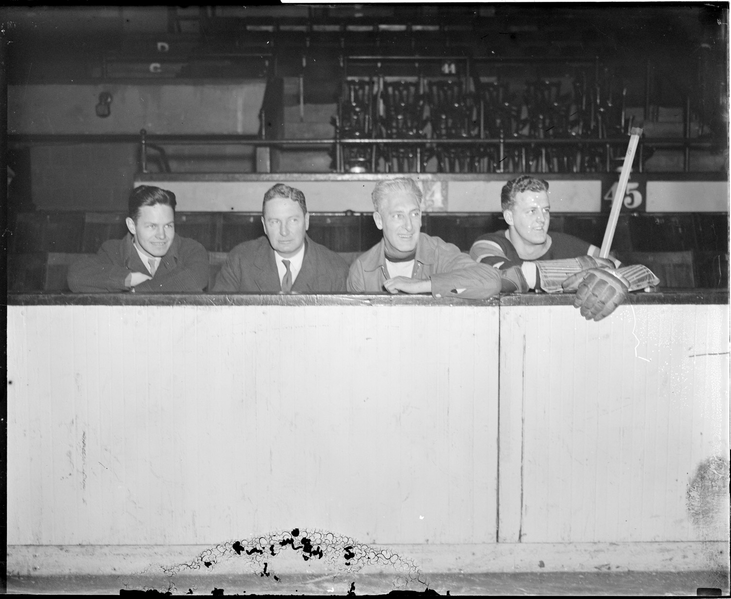 Eddie Shore of the Bruins signing a stick for a kid, Boston Garden