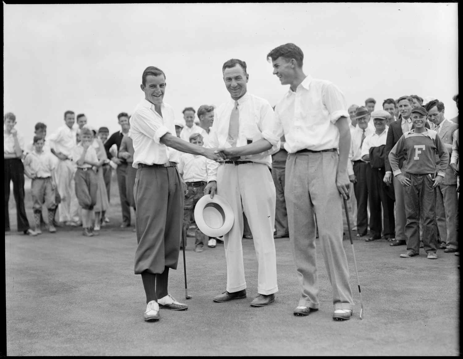 L to R - Ruggles, Art Rose, Ed Peterson at 14th green where Ruggles was 5 up on Peterson in Jr. Champ at Wollaston