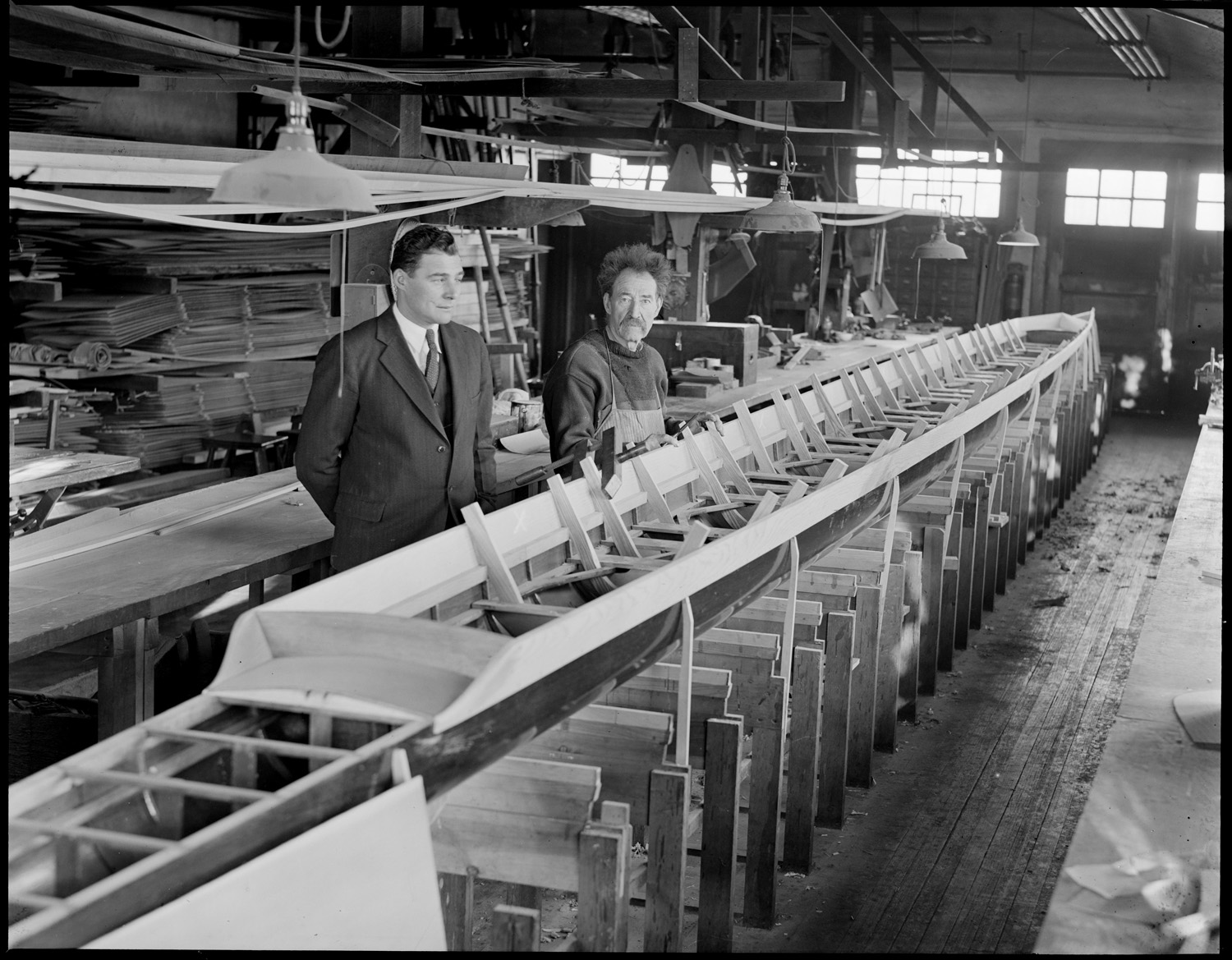 Eight oar scull being built at Harvard. Coach Charles Whiteside (l) builder Bill Lutz (r) - 30 years of building sculls, now 72 years old.